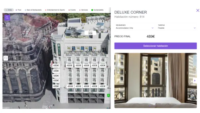 - La reserva se realizará a través de una réplica digital del hotel, que podrá consultarse de forma interactiva y explorarse virtualmente. Además del emblemático edificio construido en 1920, el proyecto también ha supuesto simular digitalmente la Gran Vía de Madrid