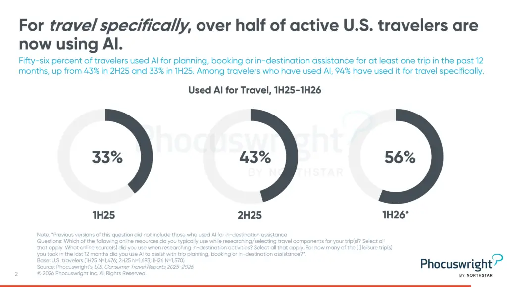 En el sector de los viajes, más de la mitad de los viajeros en Estados Unidos ya utilizan inteligencia artificial. Según el último informe de Phocuswright, The AI Surge: Travel’s Fastest Behavioral Shift in a Decade, el 56% de quienes han viajado recientemente ha recurrido a la IA para planificar, reservar o recibir asistencia durante su viaje en al menos una ocasión en los últimos 12 meses. Esta cifra ha crecido notablemente desde el 43% en la segunda mitad de 2025 y el 33% en la primera mitad de ese mismo año. Entre quienes ya han probado la IA, el 94% la ha utilizado específicamente para viajes.