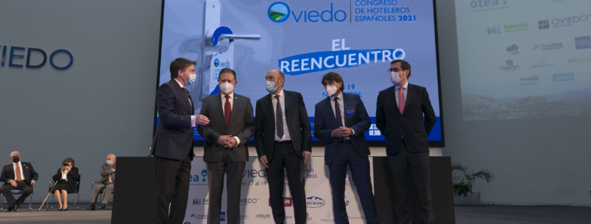 El pasado 18 de noviembre, dio comienzo la jornada de ponencias del XVIII Congreso de Hoteleros Españoles, que fue inaugurada por Fernando Valdés, secretario de Estado de Turismo; Antonio Garamendi, presidente de la Confederación Española de Organizaciones Empresariales (CEOE); Juan Manuel Cofiño, vicepresidente del Principado de Asturias; Alfredo Canteli, alcalde de Oviedo; Jorge Marichal presidente de la Confederación Española de Hoteles y Alojamientos Turísticos (CEHAT); y José Luis Álvarez Almeida, presidente de Hostelería y Turismo en Asturias (OTEA).