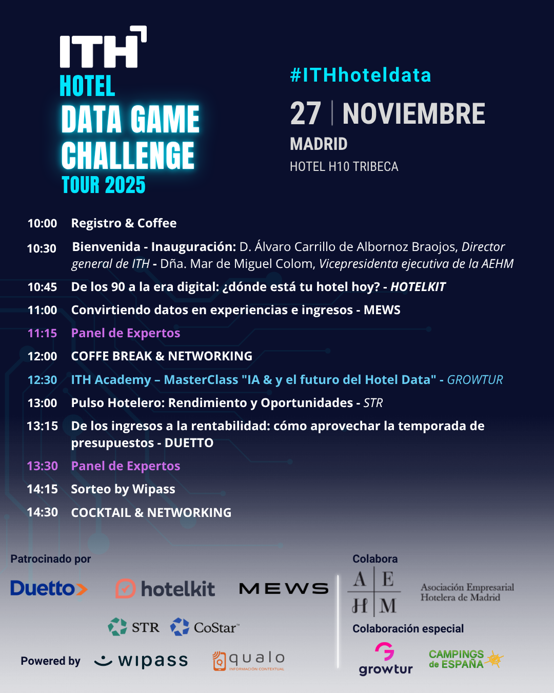 A través de talleres prácticos y casos reales, en estas jornadas ITH The Hotel Data Game Challenge 2025, especializadas en el uso de la inteligencia de datos descubrirás su aplicación en revenue management, benchmarking, distribución, personalización de experiencia del cliente, reputación online y operativa interna.