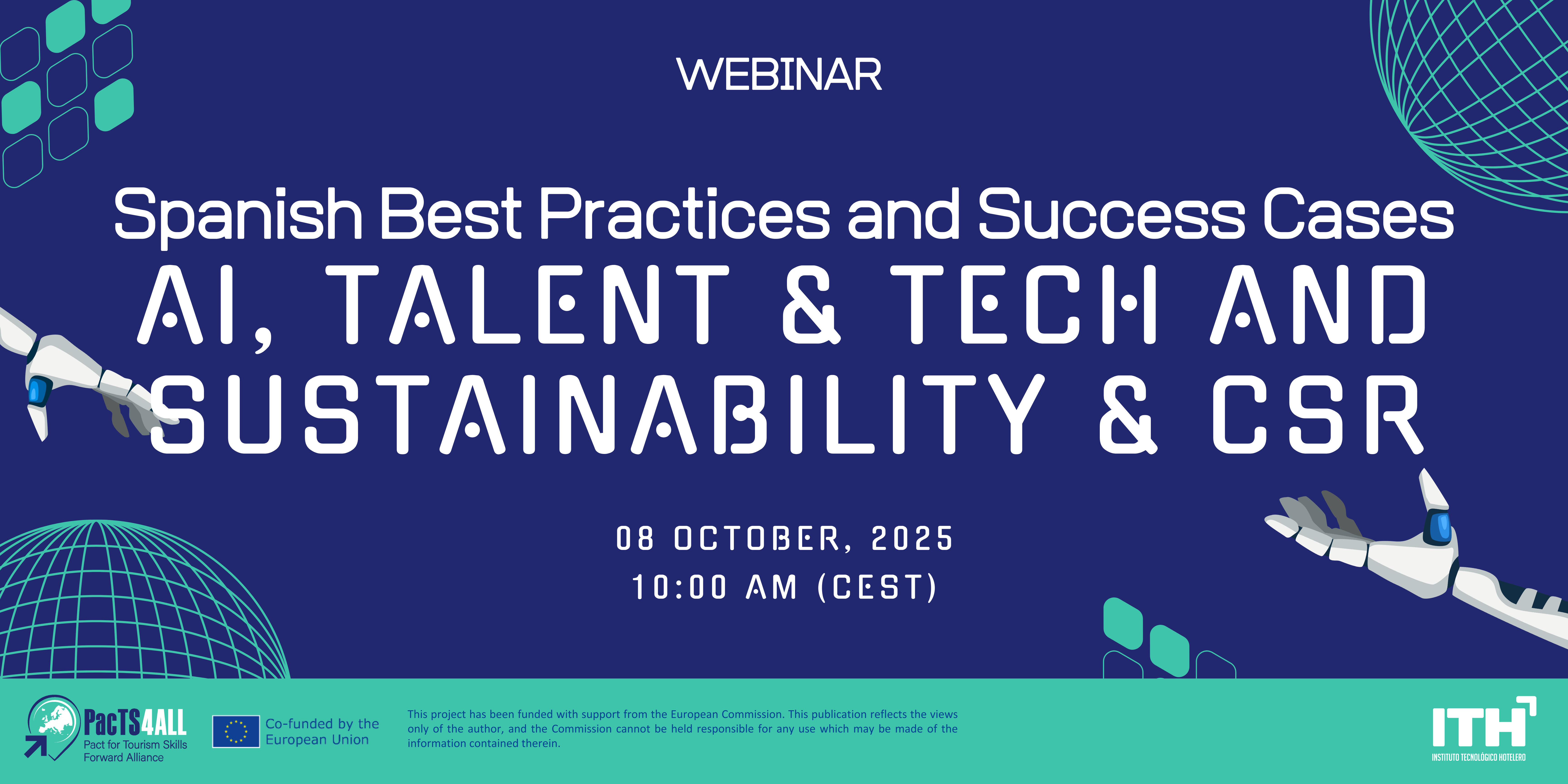 The Instituto Tecnológico Hotelero (ITH) and the European project PacTS4ALL – Pact for Tourism Skills Forward Alliance invite you to the webinar ‘Best Practices and Success Stories in AI, Talent & Tech, and Sustainability & CSR’, to be held on 8 October 2025 at 10:00 a.m. (CEST). This webinar will be held in English.
