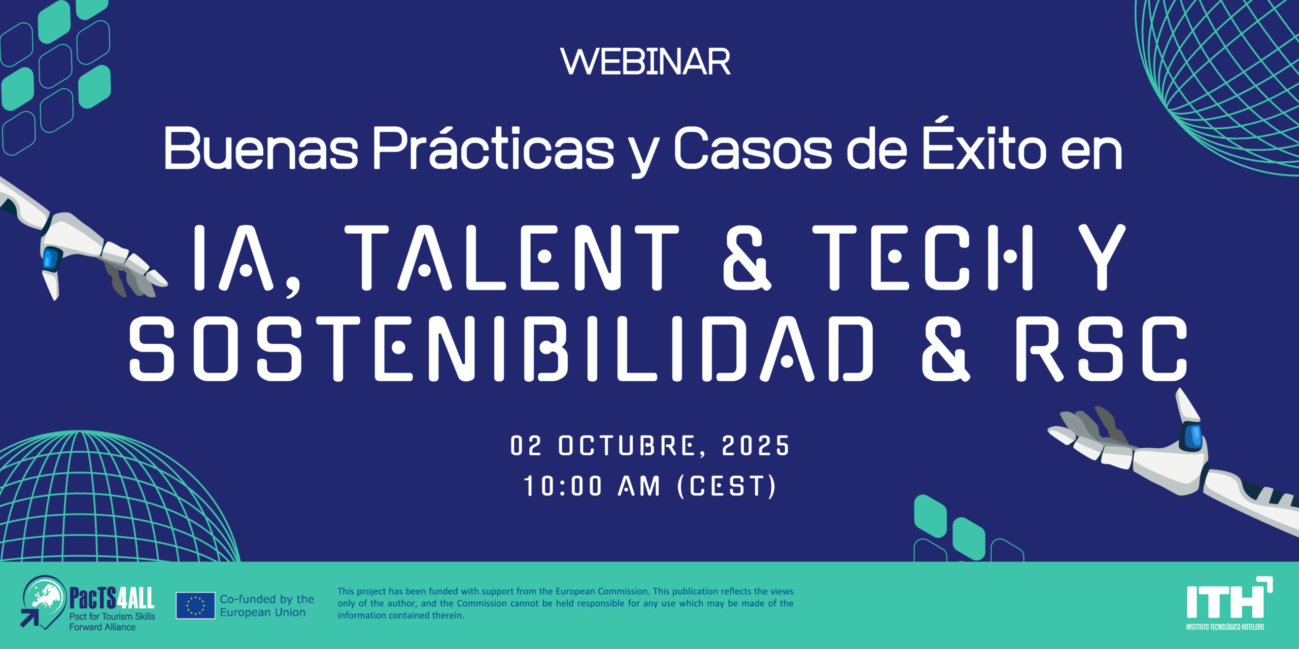 El Instituto Tecnológico Hotelero (ITH) y el proyecto europeo PacTS4ALL – Pact for Tourism Skills Forward Alliance, te invitan al webinar “Buenas Prácticas y Casos de Éxito en IA, Talent & Tech y Sostenibilidad & RSC”, que se celebrará el 2 de octubre de 2025 a las 10:00h (CEST).