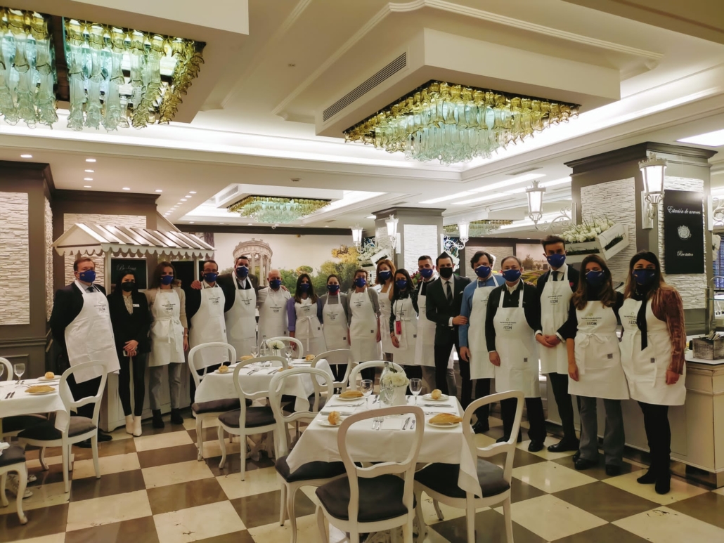 Madrid, 23 de diciembre de 2021.- Por quinto año consecutivo, el castizo establecimiento del centro de Madrid ha cedido sus instalaciones, donde el servicio ha estado encabezado por el presidente de la AEDH, D. Manuel Vegas y por el director general del Hotel Mayorazgo y director de la AEDH de Madrid, D. Manuel Á. Ruiz Sotillo. Los directores voluntarios ejercían de camareros y colaboradores en el uso del Buffet para dejar la chaqueta de director y ponerse el mandil solidario. El buffet único ofrecido por la asociación ha tenido como colofón final la entrega de varios regalos sorpresa a los invitados.