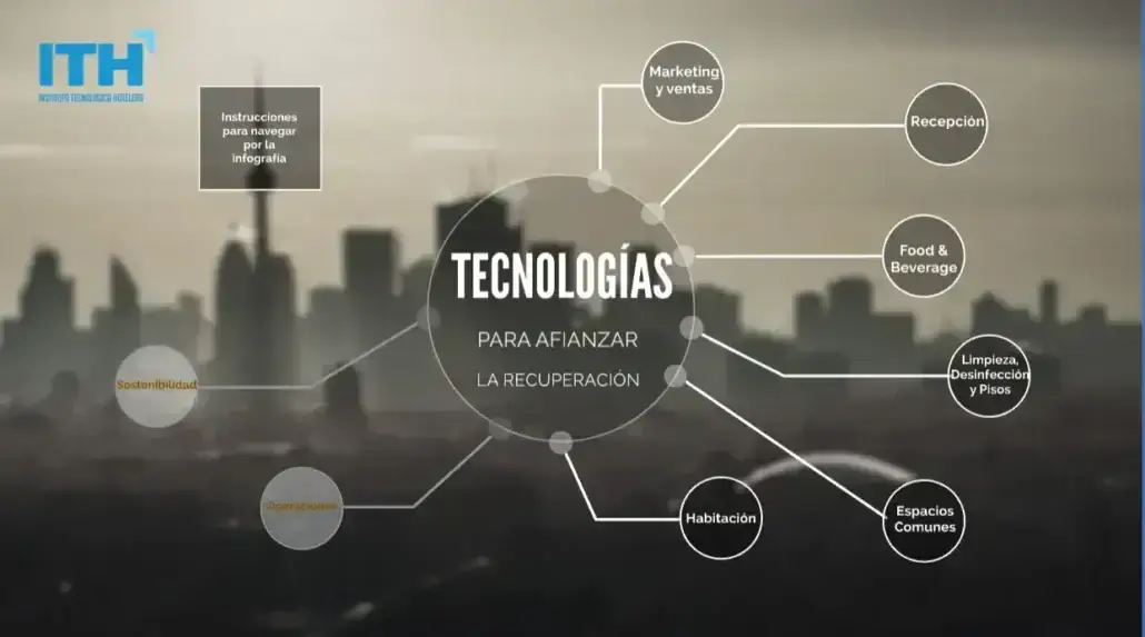 En esta infografía podrá navegar localizando las diferentes tecnologías clasificadas por áreas de actuación dentro de cada ámbito del establecimiento hotelero, así como clasificadas en función del tipo de herramienta (operaciones y/o sostenibilidad).